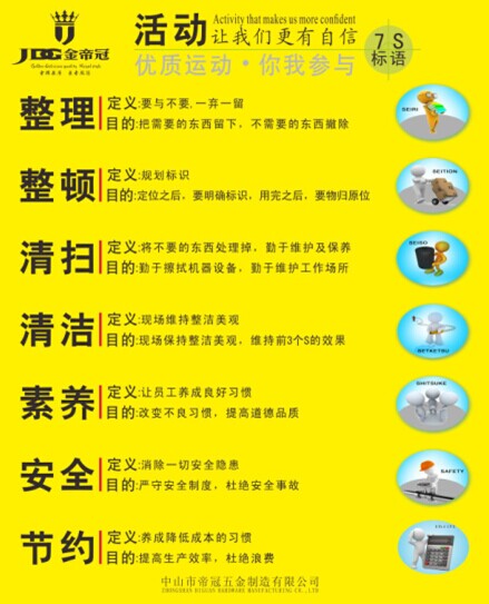 7S管理是生產(chǎn)管理的重要一環(huán),中山市帝冠五金制造有限公司同樣重視公司的現(xiàn)場(chǎng)管理,組織員工認(rèn)真學(xué)習(xí)了公司7S現(xiàn)場(chǎng)管理.